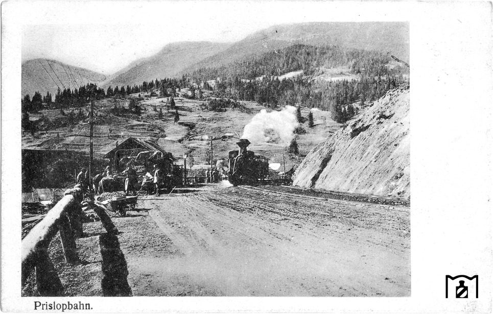 Bild 5: A_train_climbing_to_Prislop_Pass_on_PrislopbahnIhr Bau wurde notwendig, da die einzige bestehende Eisenbahnverbindung zwischen der Bukowina und dem übrigen Österreich-Ungarn infolge der Besetzung des größten Teils Galiziens durch russische Truppen im Jahr 1914 unterbrochen wurde. Infolgedessen wurde zwischen dem 15. Februar 1915 und dem 1. Mai 1916 diese alternative Militärroute gebaut, die eine strategische Verbindung mit dem Rest des Territoriums hinter der Front herstellen konnte. Mehr als 2.000 Soldaten wurden in den Lagern in Borșa, Kârlibaba und Prislop eingesetzt, um die Eisenbahn zu verteidigen und die Frontlinie zu stärken. Die Eisenbahn war bis November-Dezember 1918 in Betrieb, als das rollende Material nach Ungarn abgezogen und die Nebengebäude größtenteils zerstört wurden. In den Jahren 1930-1931 wurde die Strecke abgebaut, wobei das Eisenbahnmaterial entweder für den Bau der Eisenbahn im Wassertal oder für die Reparatur einiger Strecken im Gebiet von Czernowitz verwendet wurde.