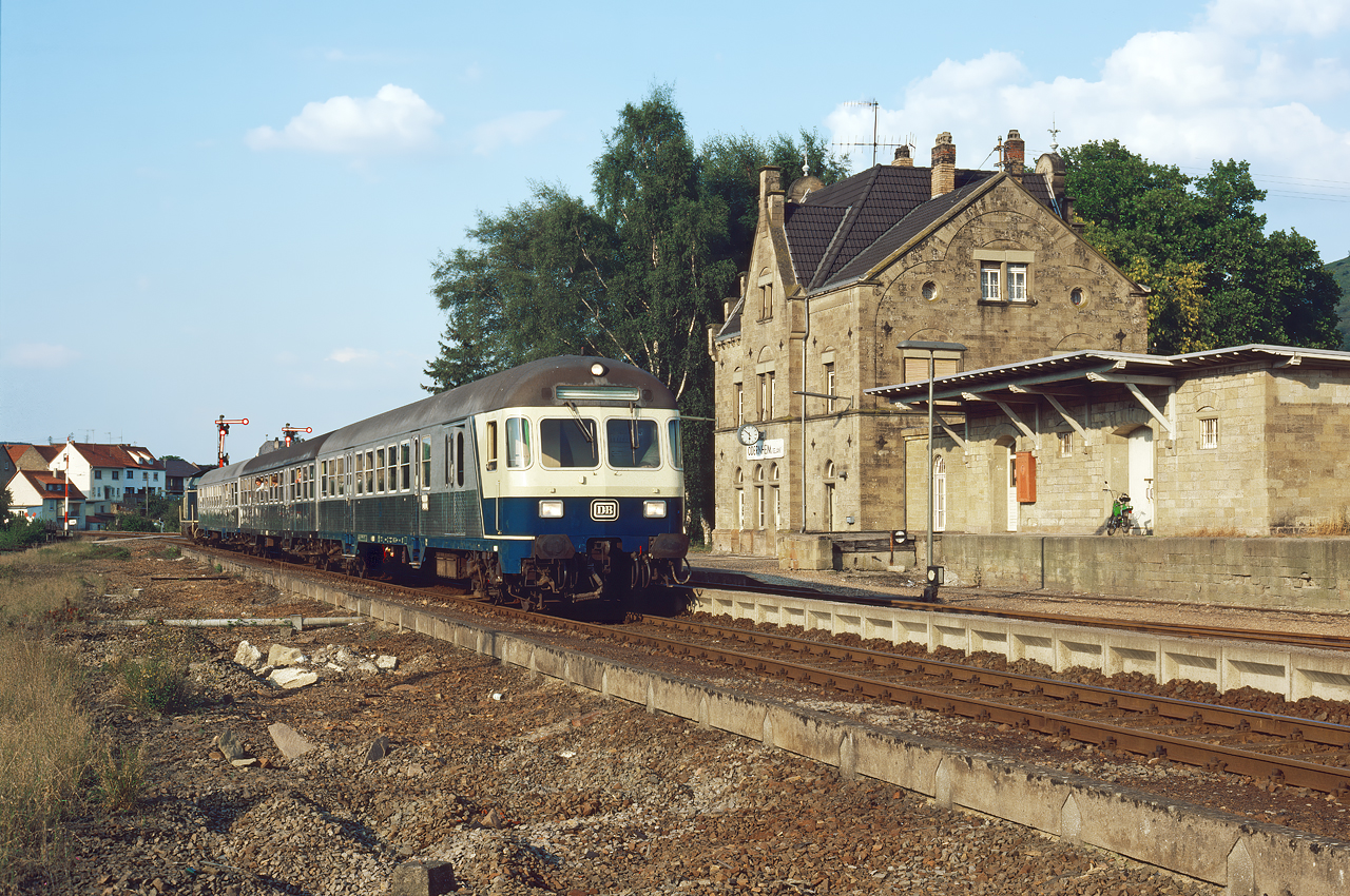 Soo...Wer den längsten hat, dürfte geklärt sein..;-) Mal sehen, wer den kürzesten zieht! Und da bieten sich gleich mehrere Strecken zur Auswahl an: einteilige Schienenbusse waren u.a. auf Traunstein-Waging unterwegs, auf Straubing - Bogen Ost, im Raum Wasserburg, auf vielen anderen fast vergessenen Strecken - und auf Bullay - Traben-Trarbach. Hier pendelte in den 90er Jahren noch ein Solo-798 vom Bw Trier immer hin und her. Er machte natürlich auf der Moselbrücke in Bullay und erst recht auf dem endlos langen Hangviadukt von Pünderich eine fast schon fipsige Figur - aber auf das kleine Viadukt in der Ortslage von Reil passte er hervorragend! Dieses Viadukt ist in der Galerie bereits mit mehreren Bildern vertreten, und ich verlinke mal beispielhaft diese Aufnahme: [www.drehscheibe-online.de] Der 12.08.90 war ein heißer Sommertag, und wir sehen keinen Fotohalt, wo die Teilnehmer in ihrer Hektik vergessen haben, die Türen zu schließen - sondern die ganz normale Vorbeifahrt eines 798 als N 8453 von Traben-Trarbach nach Bullay. Scan vom Fuji-100 Kleinbilddia, neu gescannt und einen Tick heller aufbereitet Datum: 12.08.1990 Ort: Reil [info] Land: Rheinland-Pfalz BR: 798 (alle Schienenbusse Bauart Bundesbahn) Fahrzeugeinsteller: Deutsche Bundesbahn Kategorie: Bahn und Infrastruktur Top 3 der Woche: 7 Punkte 2 Kommentare [»] |